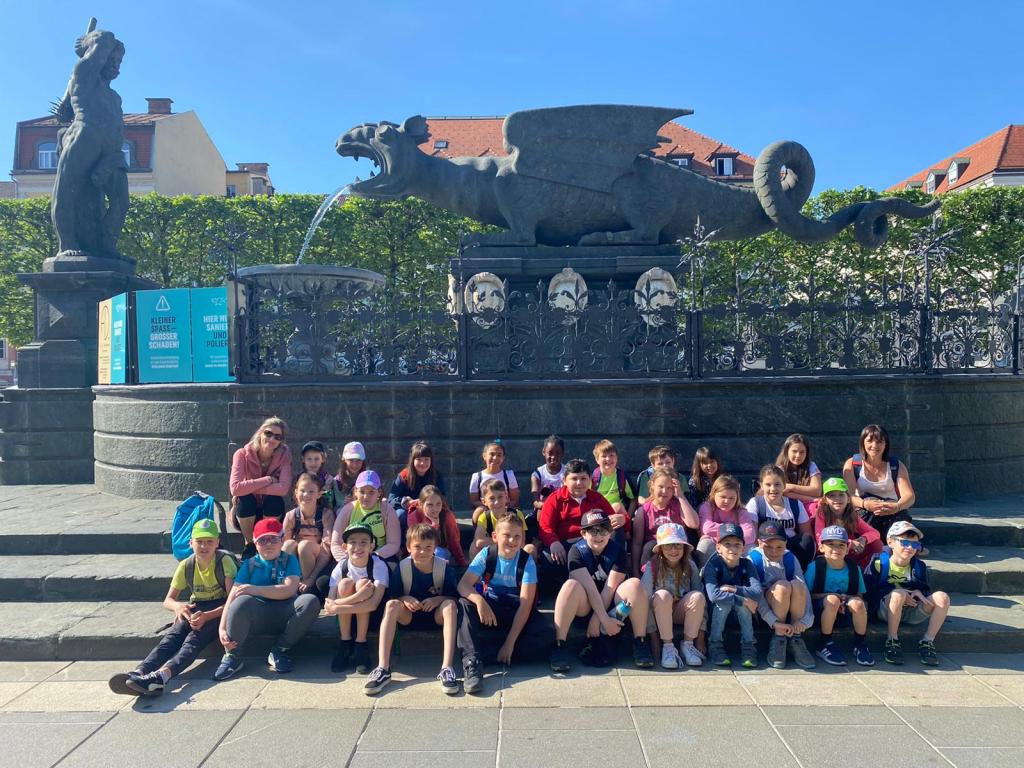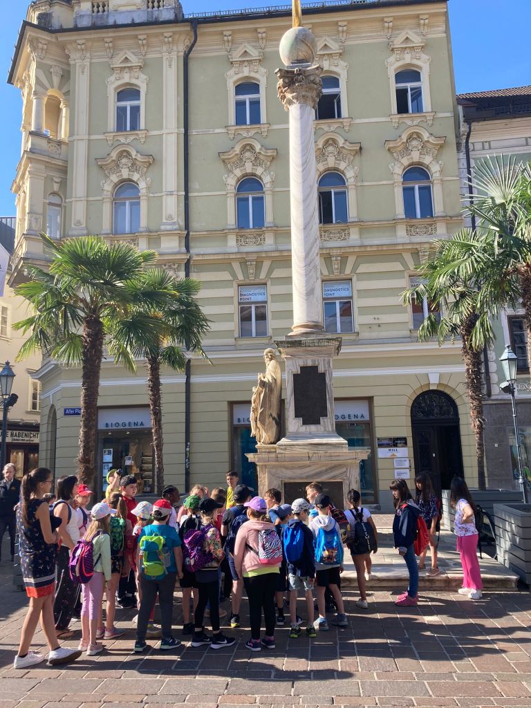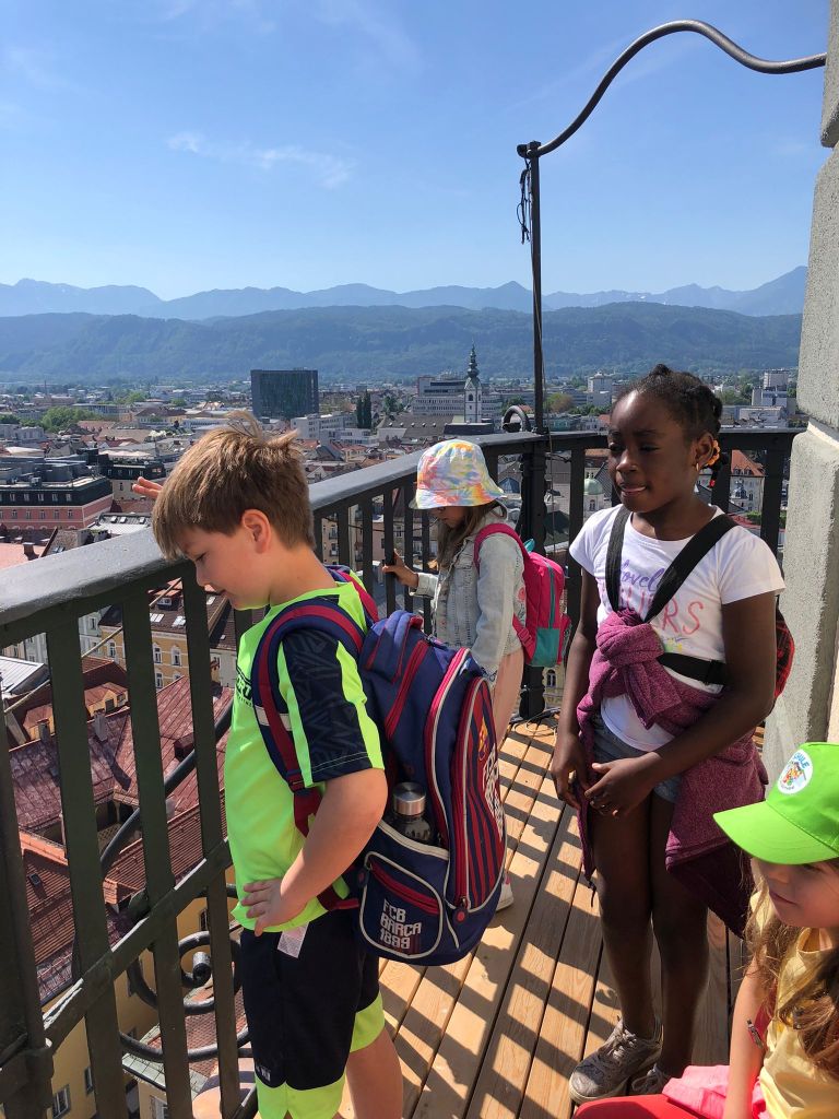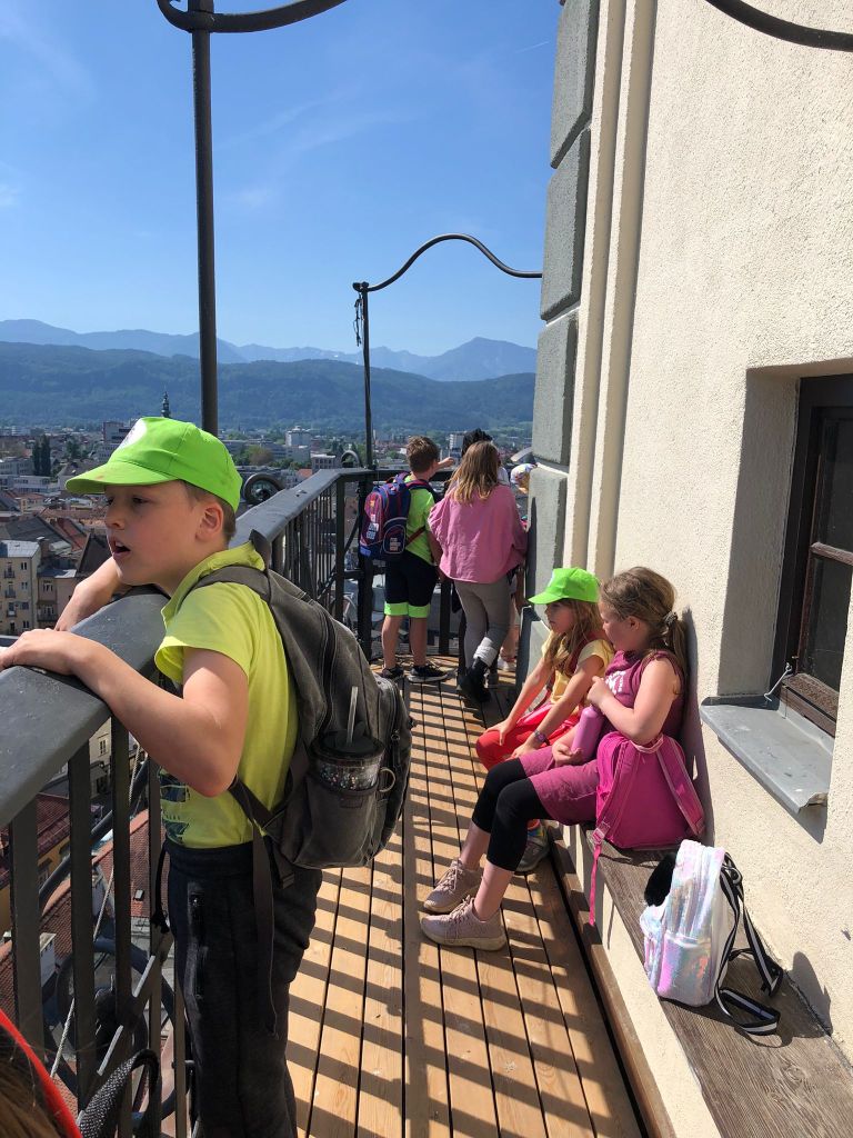 Die zweite und dritte Klasse begab sich auf Entdeckungsreise rund um die Denkmäler Klagenfurts. Dabei wurde auch der neu renovierte Stadtpfarrturm erklommen.
