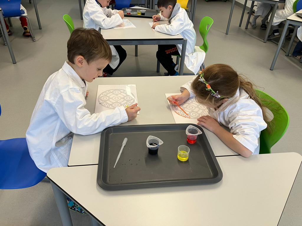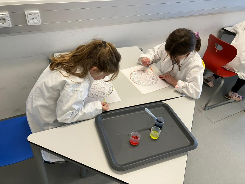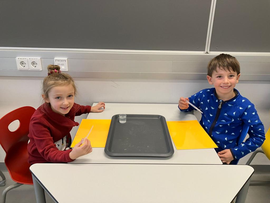 Die Kinder zeigen nicht nur im Wasser großes Geschick, auch beim Besuch am BIKO zeigen sie in ihren Forschermänteln großes Geschick beim Arbeiten mit Pipette, Pinzette und Co.