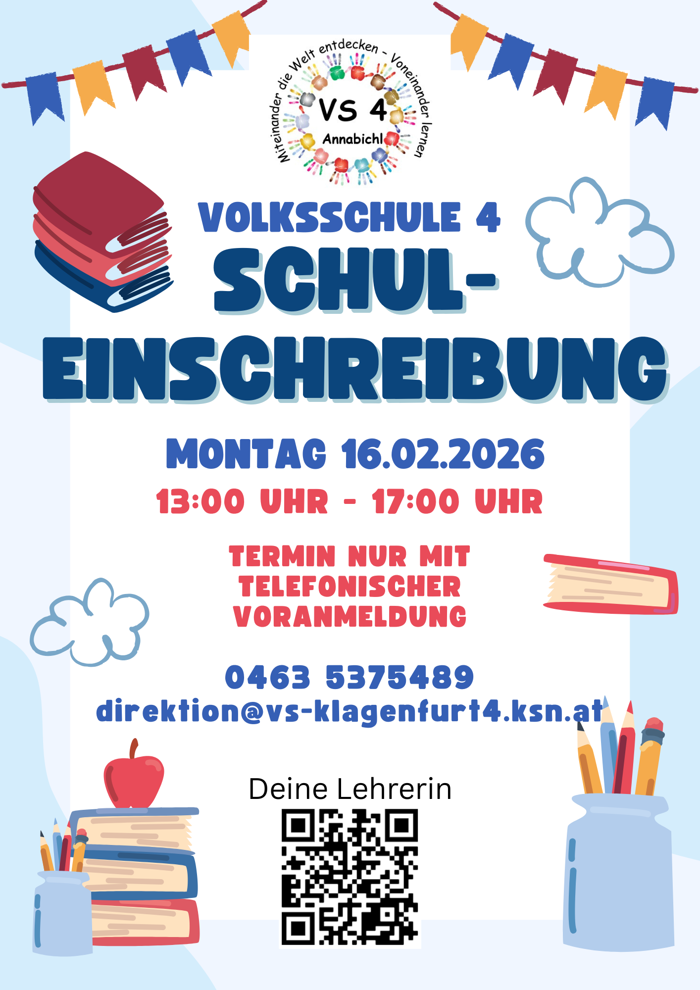 Schuleinschreibung der Volksschule 4 in Klagenfurt Annabichl am Montag den 16.02.2026 von 13:00 Uhr bis 16:30 Uhr ein.